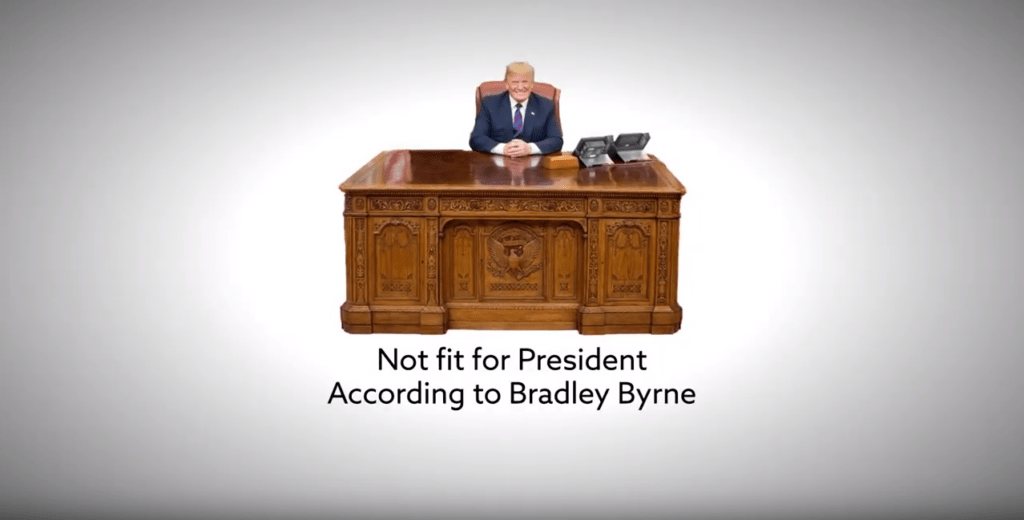 “Today, Byrne claims to back Trump, but did he ever apologize for trashing Trump?” the narrator adds. “Bradley Byrne, unfit for the Senate.”