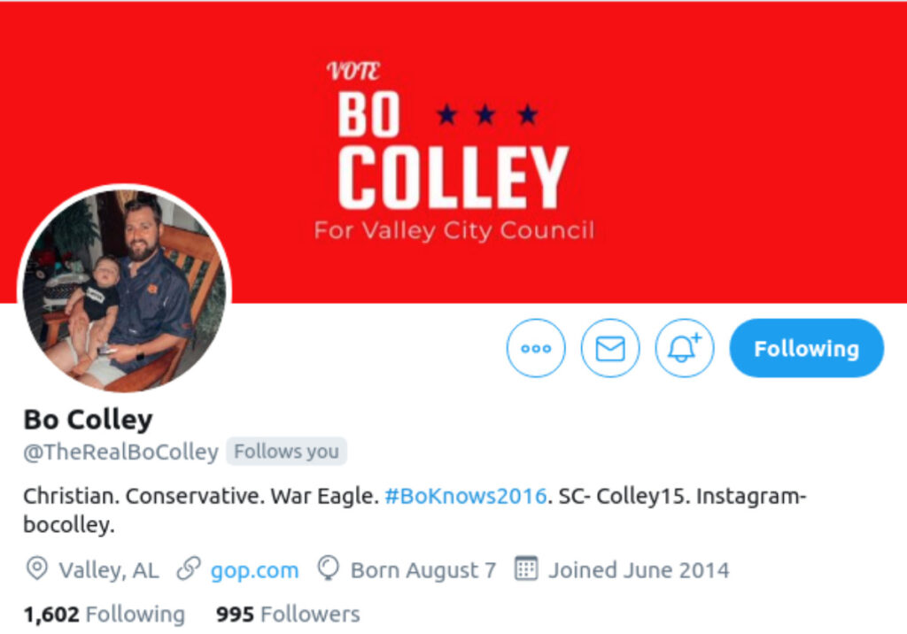 Offensive Twitter History For Valley, AL Council Candidate Bo Colley
