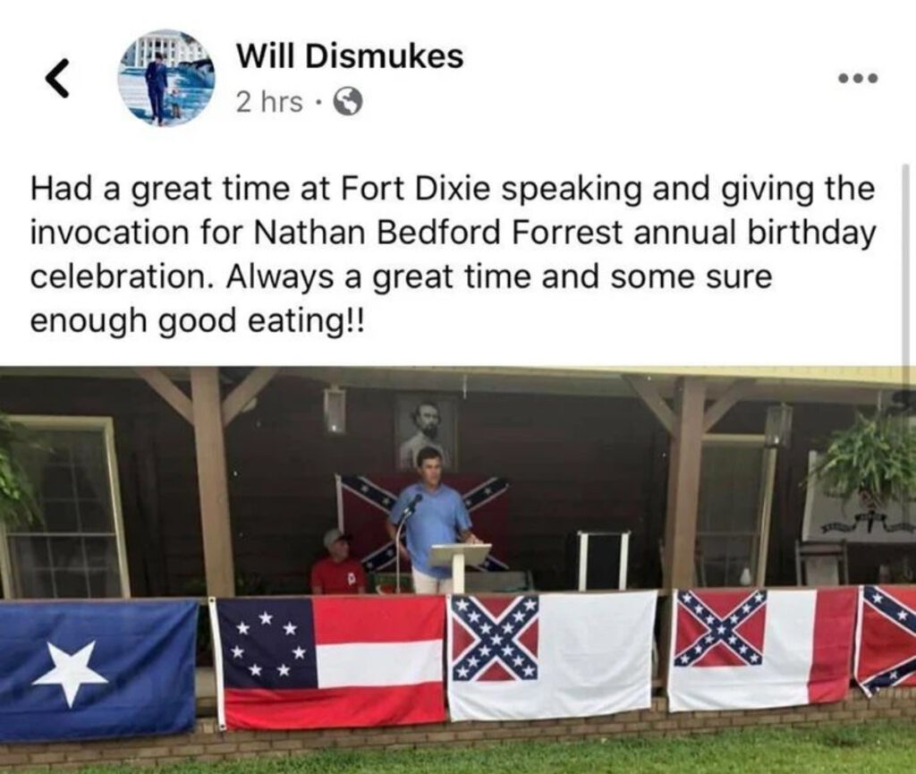 The Democratic party took to Twitter and used Dismukes’ Facebook post to fundraise yesterday, using a screenshot of Dismukes’ now-deleted post where he stated, “Had a great time at Fort Dixie speaking and giving the invocation for Nathan Bedford Forrest annual birthday celebration. Always a great time and some sure enough good eating!!”